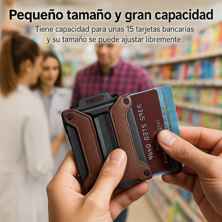 Combina estilo y funcionalidad con nuestra billetera inteligente. Su exterior de cuero premium y su interior de fibra de carbono la hacen resistente y duradera.