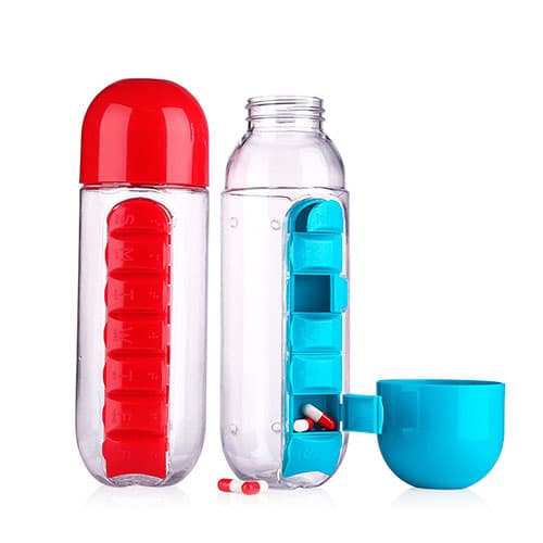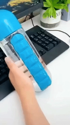 Termo de 800 ml con compartimentos integrados para medicamentos y suplementos, lo que te permite llevar todo lo que necesitas en un solo lugar de forma práctica y organizada.