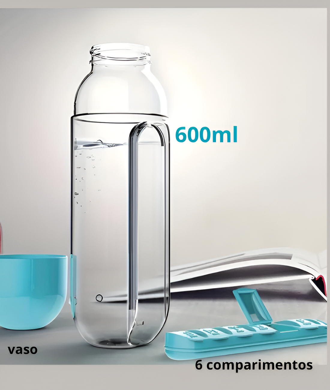 ¡Tu Bienestar Diario, Simplificado! Termo de 600 ml con Pastillero Abatible y Taza Integrada